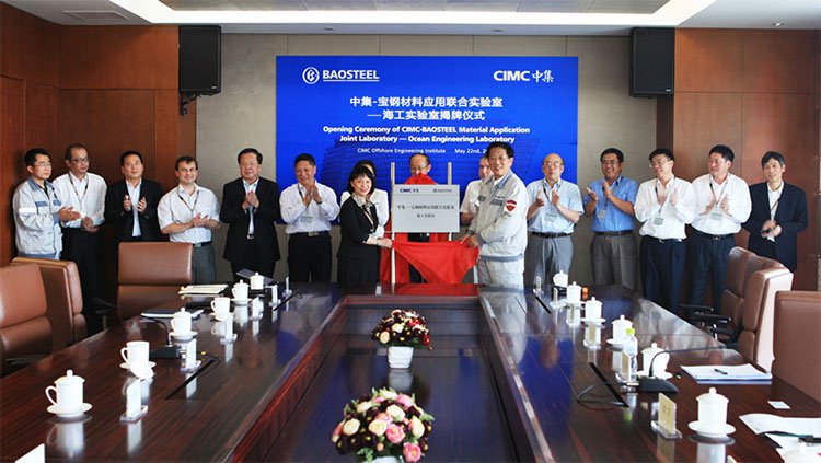 2015年5月22日,中集—寶鋼材料應(yīng)用聯(lián)合實驗室揭牌儀式在煙臺中集海洋工程研究院舉行。山東省科技廳副廳長于書良、煙臺市副市長張廣波、烏克蘭國家科學(xué)院合作局局長SERGIY MYAKUSHKO 、寶鋼股份副總經(jīng)理王靜、中集來福士總裁于亞等參加了揭牌儀式。