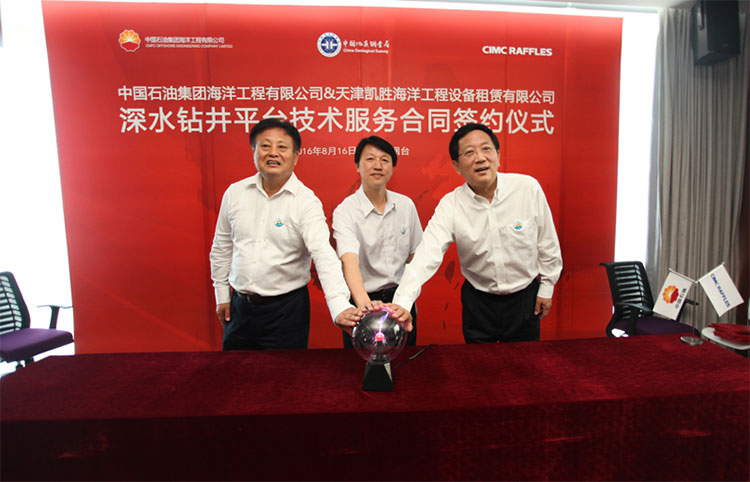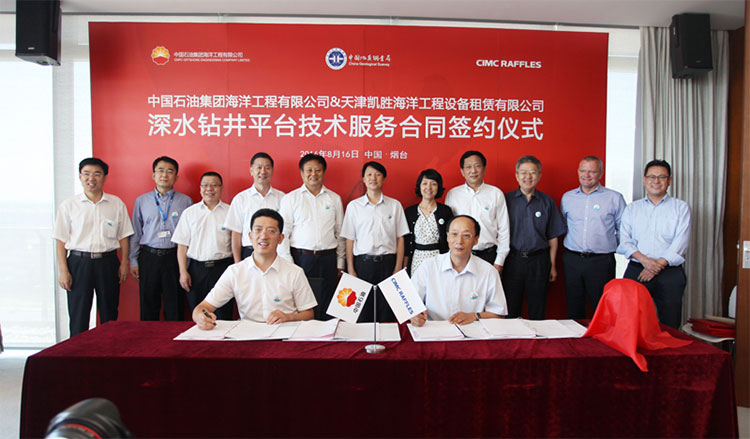 2016年8月16日,中國石油集團海洋工程有限公司(簡稱“中油海”)與煙臺中集來福士海洋工程有限公司(簡稱“中集來福士”)在煙臺簽署了D901#超深水鉆井平臺技術服務合同。中國石油集團公司總經理助理王鐵軍、中油海總經理劉圣志、中集集團副總裁于亞、中集來福士總裁王建中等出席簽約儀式。該平臺交付后,將為中油海提供海上能源勘探服務。