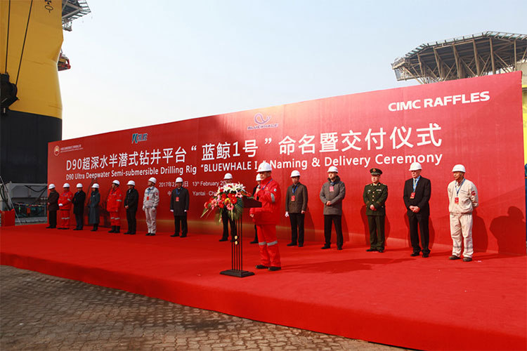 2017年2月13日,煙臺中集來福士海洋工程有限公司(簡稱“中集來福士”)建造的全球最先進(jìn)超深水雙鉆塔半潛式鉆井平臺“藍(lán)鯨1號”在煙臺命名交付,這是中國船廠在海洋工程超深水領(lǐng)域的首個“交鑰匙”工程,具有里程碑意義。該平臺將由Bluewhale聯(lián)合中國石油集團(tuán)海洋工程有限公司(簡稱“中油海”)共同履行服務(wù)合同,進(jìn)行海洋能源勘探。