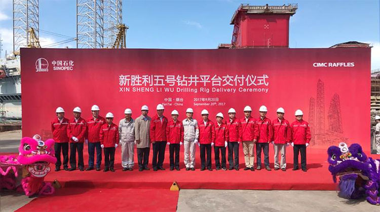 2017年9月20日上午,中集來福士煙臺基地一號碼頭鑼鼓陣陣、彩旗飄揚。中集來福士為中石化總裝建造的新勝利五號自升式鉆井平臺順利舉行交付儀式。中石化石油工程技術服務有限公司副總經(jīng)理左堯久、中石化集團公司發(fā)展計劃部副主任劉會友、中石化海洋工程有限公司韓來聚、中石化海洋石油工程有限公司海洋鉆井公司黨委書記、經(jīng)理許軍富、中國船級社總部海工檢驗管理處處長朱琪、中集來福士總裁王建中、中集來福士副總裁趙暉等參加了此次儀式。