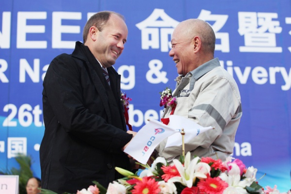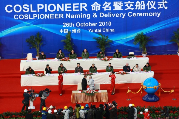 10月26日上午,中國首座深水半潛式鉆井平臺COSLPIONEER在煙臺舉行交船儀式。國家工信部裝備司副司長李東、國家能源局能源節約和科技裝備司副司長黃鸝、山東省國防科工辦主任王超英、煙臺市市長張江汀、煙臺市副市長王國群,中國海洋石油總公司副總經理兼中海油田服務股份有限公司(以下簡稱“中海油服”)董事長劉健,中海油服首席執行官兼總裁李勇,招商局集團總裁兼中集集團董事長李建紅、中集集團總裁兼中集來福士海洋工程(新加坡)有限公司董事長麥伯良、中集集團副總裁兼煙臺中集來福士海洋工程有限公司董事長于亞、煙臺中集來福士海洋工程有限公司首席執行官章立人,挪威王國駐華大使斯文、挪威船級社總裁Tor E. Svensen等出席了COSLPIONEER的交船儀式。