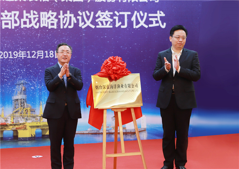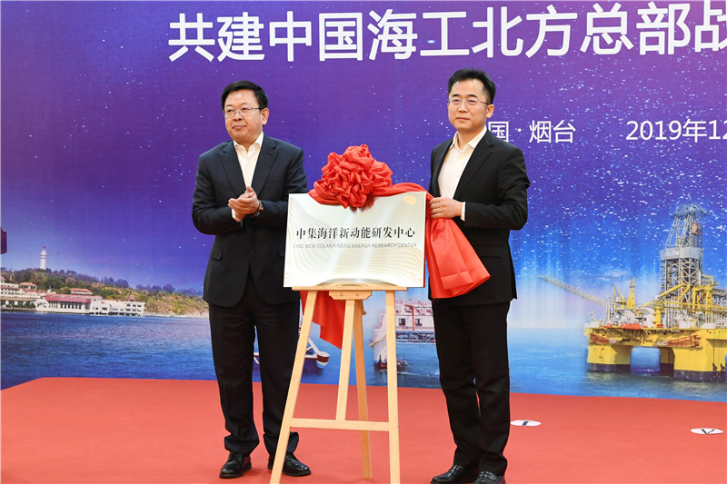 陳飛、高翔共同為籌建中的中國海工北方總部、煙臺深藍海洋漁業有限公司揭牌。張代令、王建中分別代表煙臺市政府、中集集團簽署協議,并共同為中集海洋新動能研發中心、中集海洋油氣研發中心揭牌。