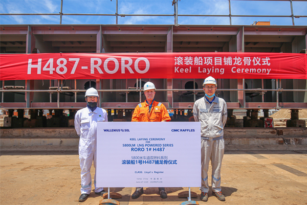 2020年6月22日上午11時(shí),由中集來(lái)福士為瑞典航運(yùn)巨頭Wallenius SOL公司建造的世界最大的5800米車道雙燃料冰級(jí)滾裝船2+2系列的第一艘H487項(xiàng)目的鋪龍骨儀式在煙臺(tái)基地如期舉行。船東方代表、勞氏船級(jí)社負(fù)責(zé)人、外包商、煙臺(tái)基地代表及項(xiàng)目團(tuán)隊(duì)人員出席了本次儀式,共同見(jiàn)證了該首艘滾裝船在3月30日生產(chǎn)開(kāi)工后,邁入更加全面高效的生產(chǎn)新階段。