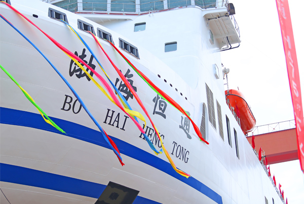 “渤海恒通”輪總長(zhǎng)189.9米,型寬26.4米,上甲板高度15.4米,擁有3米寬度的車道約2700米,?3層車輛艙,設(shè)計(jì)吃水6米,續(xù)航力最大約5000海里,服務(wù)航速可達(dá)到17節(jié),是目前亞洲最大的多用途滾裝船。該船為雙機(jī)、雙槳、尾機(jī)型的大型滾裝運(yùn)輸船舶,其推進(jìn)裝置采用2臺(tái)船用中速柴油機(jī),分別通過減速齒輪箱及傳動(dòng)軸系驅(qū)動(dòng)可變螺距螺旋槳,是承載各類貨車、轎車及集裝箱的現(xiàn)代化節(jié)能環(huán)保型多用途滾裝船。配備艏側(cè)推、減搖鰭和防橫傾裝置,三甲板為全通甲板,艏艉上下車,配備艏跳板、艉直跳板、艉斜跳板、斜坡道和升降平臺(tái);機(jī)艙設(shè)備采用國(guó)際品牌,配備2臺(tái)MAN主機(jī),單臺(tái)最大功率4500kw。船舶配備先進(jìn)的通導(dǎo)設(shè)備和動(dòng)力設(shè)施;減搖鰭和減搖水艙提高了船舶抗風(fēng)等級(jí)、船舶安全性和舒適性。船舶還專門配備了船員健身房,讓船員在工作之余,有更多休閑娛樂空間。該船將交付給由渤海輪渡與恒通物流股份有限公司、龍口港有限公司成立的渤海恒通輪渡有限公司,用于運(yùn)營(yíng)渤海灣及國(guó)內(nèi)沿海滾裝運(yùn)輸業(yè)務(wù)。