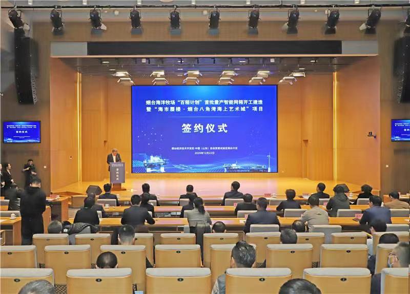 12月22日,煙臺海洋牧場“百箱計(jì)劃”首批量產(chǎn)智能網(wǎng)箱開工建造暨“海市蜃樓?煙臺八角灣海上藝術(shù)城”項(xiàng)目簽約儀式在煙臺開發(fā)區(qū)舉行。煙臺市委副書記、市長陳飛,煙臺海關(guān)黨委書記、關(guān)長林騰霄,煙臺開發(fā)區(qū)黨工委書記、管委主任牟樹青,觀念藝術(shù)家、當(dāng)代藝術(shù)策展人、建筑師梁克剛,中集來福士黨委副書記、助理總裁楊易川等領(lǐng)導(dǎo)和嘉賓出席儀式并見證簽約。