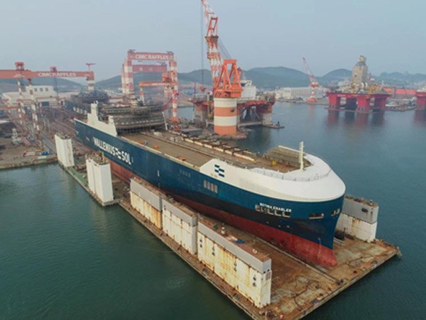 2021年7月9日,由中集來福士為瑞典航運巨頭Wallenius SOL公司建造的5800米車道雙燃料冰級系列滾裝船的第一艘RORO1#項目在煙臺基地順利下水漂浮。