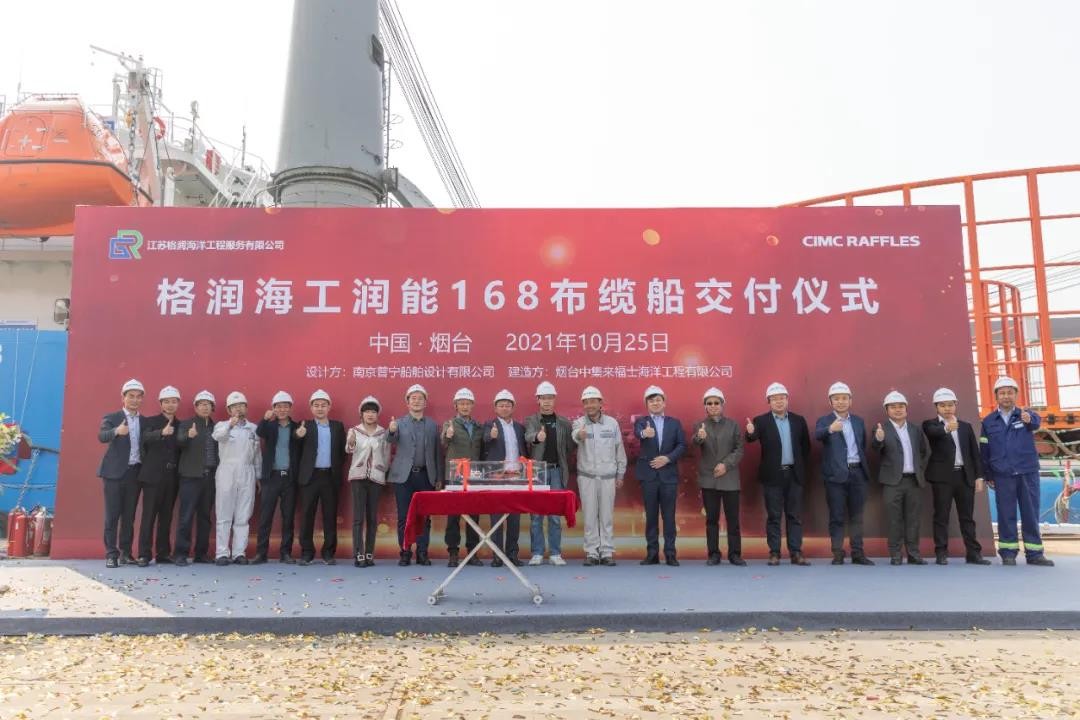 2021年10月25日上午,由南京普寧船舶設計有限公司承擔設計,中集來福士海洋工程有限公司負責改造的江蘇格潤海洋公司服務有限公司“潤能168”布纜船在中集來福士煙臺建造基地完成交付。船東方江蘇格潤海洋公司服務有限公司和其母公司格潤國際控股代表,中國船級社煙臺辦事處、中集來福士等相關單位領導出席了本次儀式。